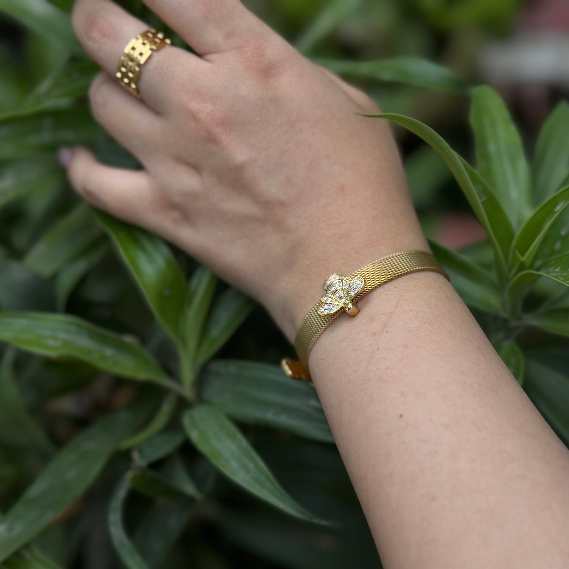 Let your wrist do the buzzing. This gold mesh bracelet features a crystal-studded bee charm that’s just the right blend of sweet and savage. Crafted to be anti-tarnish and waterproof, it’s made to survive chaotic days, spontaneous dives, and everything in between. Wear it solo or stack it up—either way, you’re serving queen bee energy.