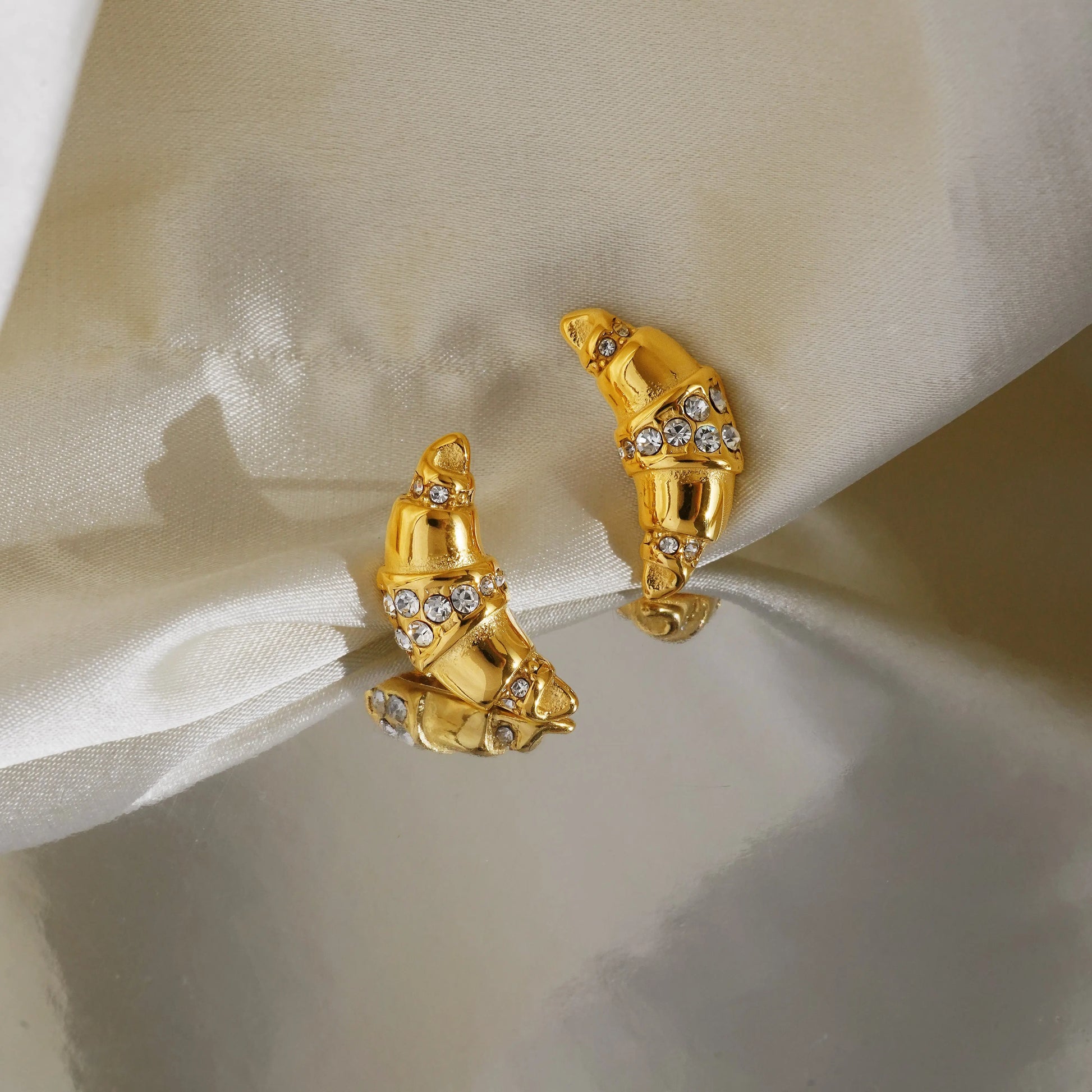 Butter Babe – Gold Croissant Earrings serve sculptural glam with a side of sass. Inspired by the perfect flaky pastry (but way shinier), these chunky gold huggies feature a textured swirl and crystal accents that catch the light—and the compliments. Sweet, bold, and a little extra—just how we like it.