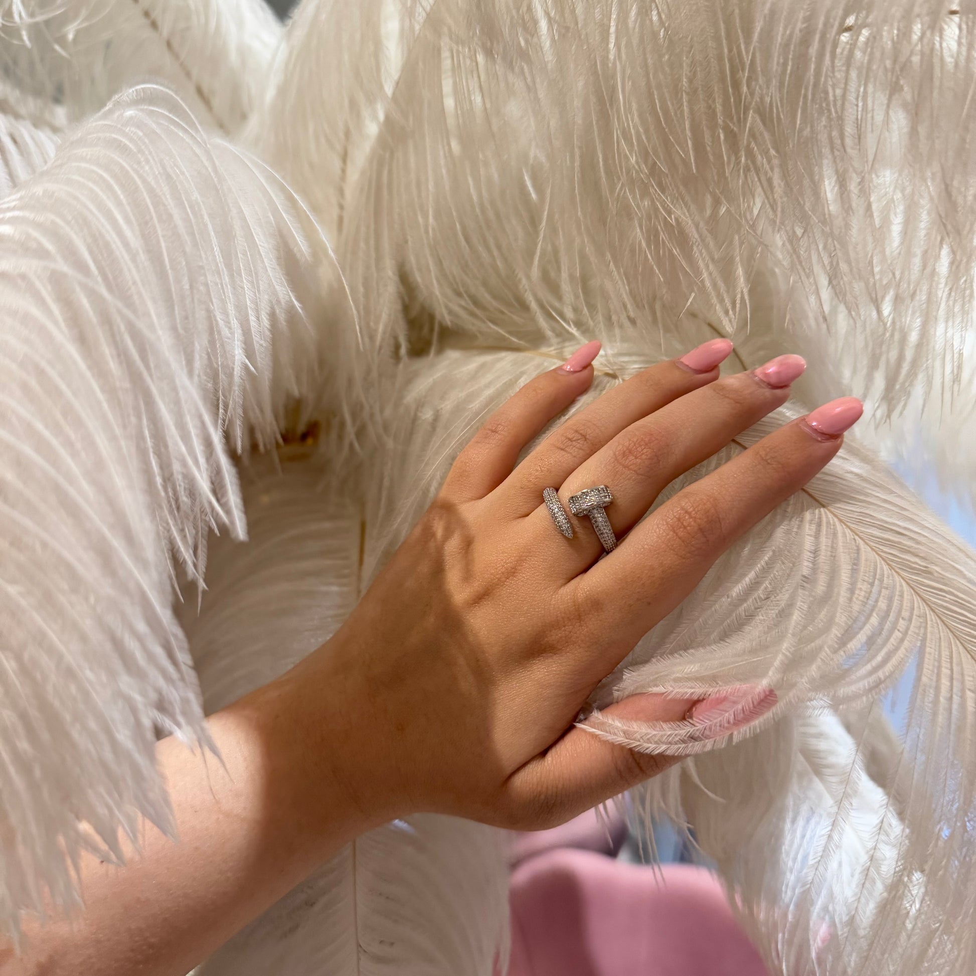 She’s not one to play it safe — and neither is this ring. Inspired by a coiled nail, this silver pavé wrap-around band brings just the right amount of chaos to your sparkle. Wear it solo or stack it loud — either way, it screams main character energy. Anti-tarnish, waterproof, and unbothered — just like you.